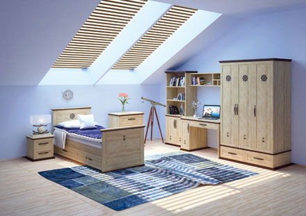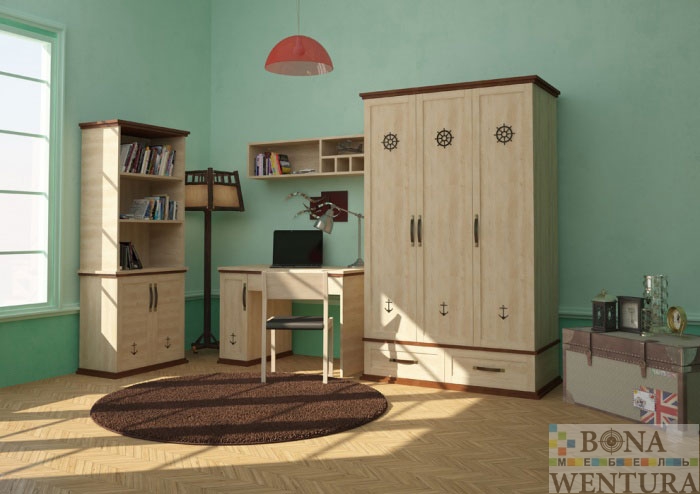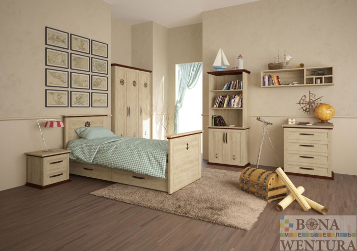 Skipper – это детская комната для мальчика, выполненная в морском стиле. Маленький непоседа всегда найдет, чем заняться: в этой комнате он сможет устроить аврал или провести спокойный вечер в кают-компании за изучением морского атласа. Поверить, что все это происходит на настоящем корабле, моряку поможет мебель цвета дуба, «морской» декор и отделка из натуральной кожи. Такая комната прекрасно подойдет для принятия первых смелых решений. Плавные обтекаемые формы, закругленные детали и безопасные ручки предохранят ребенка от травм. Кровать, входящая в состав коллекции, представляет собой стандартное спальное место, на котором будет удобно даже взрослому. Она оборудована выкатной нишей, которую можно использовать как дополнительную кровать или ящик для белья и игрушек.