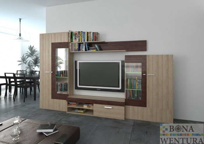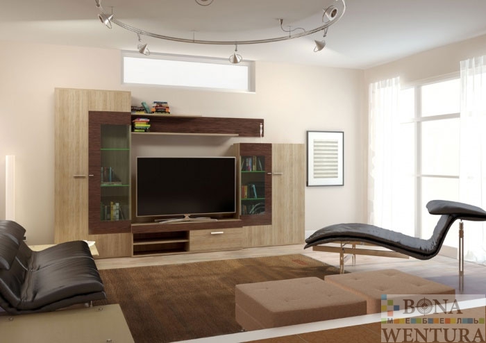 Мебель для гостиной Lion – это современная стильная гостиная, основная концепция которой – сочетание контрастов. Дизайнерское комбинирование светлого и темного материала создают завершенную композицию, при этом фактурное ДСП лаконично сочетается с гладкостью стекла. Особенно эффектно стенка Lion смотрится с подсветкой стеклянных полок, которые в очередной раз подчеркивают ее стиль и современный дизайн. Материалы: Экологически чистая ДСП Egger Австрия, цвет дуб бардолино натуральный и венге мали, фурнитура Blum (Австрия) с газовыми доводчиками. Преимущества: • Стильный дизайн. • Легкая конструкция. • Множество индивидуальных композиций. • Простота в использовании благодаря высококлассной фурнитуре.