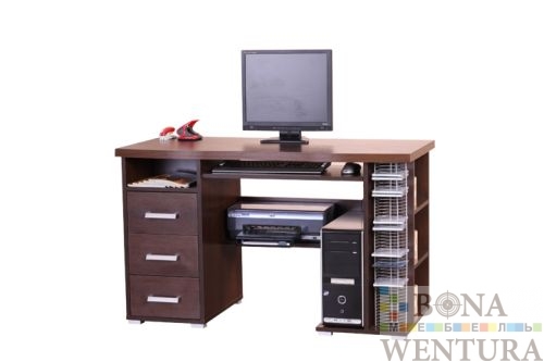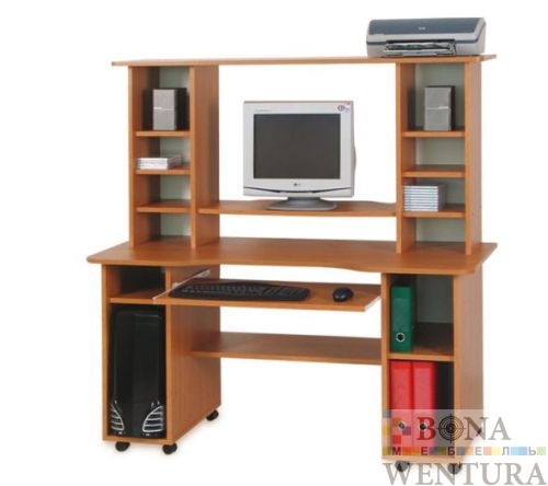 Стол компьютерный. У нас большой выбор компьютерных столов. В категории представлены: недорогие прямые и угловые компьютерные столы; различные цвета: венге, ольха, орех, клен и др.; модели с надстройками, подкатными тумбами, ящичками, полками под клавиатуру. Традиционный компьютерный стол, шириной 1400 мм позволит создать эффективное рабочее место и удобно расположиться за ним школьнику, студенту, работнику офиса. Стол оснащен тумбой с тремя ящиками и полкой под системный блок. Стол универсальный и может быть собран как в правом, так и в левом исполнении (зависит от расположения системного блока). Столешница имеет анатомическую форму. Стол компьютерный изготовлен из высококачественной ламинированной ДСП. Торцы деталей отделаны противоударным кантом ПВХ. Стол компьютерный, поставляется в разобранном виде вместе с необходимой фурнитурой и инструкцией по сборке. Хорошо упакован в гофротару.