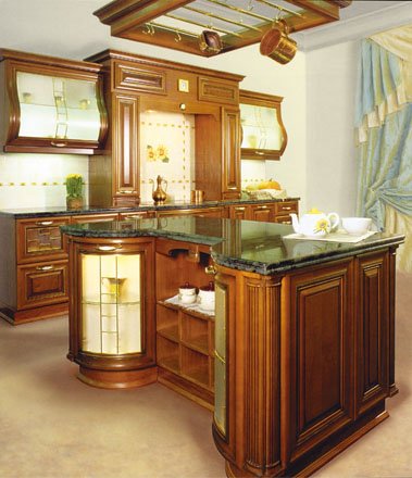 Фасад из массива и шпона липы, тонированной в цвет вишни. Рама украшена инкрустацией с позолотой. Матовое стекло с фацетом в латунной переплете под золото. Витрины и элементы фасада могут быть выгнутой формы. Возможны каркасы шпонированные на видимых частях.