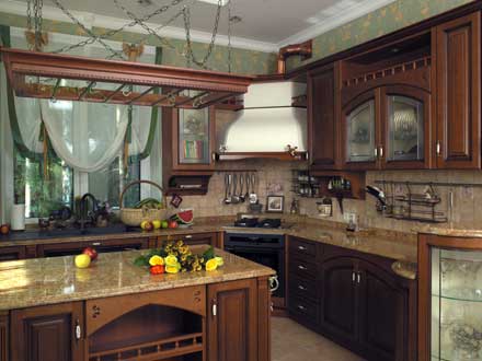 Ваш дом с этой кухней станет торжественным, великолепным, и в то же время, теплым, удобным и уютным. Фасад из массива вишни Витраж в латунном переплете под бронзу с изящным рисунком на стекле. Возможность исполнения выгнутых элементов нижних фасадов.
