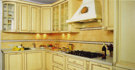 Кухня «Martinа» притягивает совершенным силуэтом. О принадлежности к классике говорят фасады из массива дуба с лаконичным резным узором и стильная фурнитура, декорированная под старину. Изюминка гарнитура - арочные витражные фасады.
