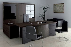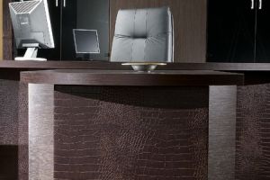 Кабинет для руководителя Sirius это достойный выбор тех, кто ценит престиж, элегантность и комфорт. Стильный кабинет, выполненный в лучших традициях офисной мебели, подчеркнет высокий статус руководителя, его изысканный вкус и стремление к идеалу. Весьма неординарная модель. В отделке данной серии используются только экологически чистые материалы. Изюминку коллекции составляет передняя панель отделанная кожей под крокодила. Завершенность и основательность придают алюминиевые металлические молдинги. Кабинет руководителя SIRIUS Технические характеристики: • Столешница: • Покрытие — меламин • Толщина — 38 мм • Кромка — АBS (пластиковое противоударное покрытие) • Опоры: деревянные боковины с кожаными накладками • Шкафы: шкаф для бумаг и гардероб высотой 200 см • Столы для переговоров: столы для переговоров:прямоугольные столы размером 270×105×77 см и 320×105×77 см