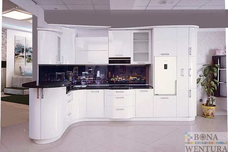 Великолепная белая кухня с контрастной черной столешницей и гнутыми фасадами.
